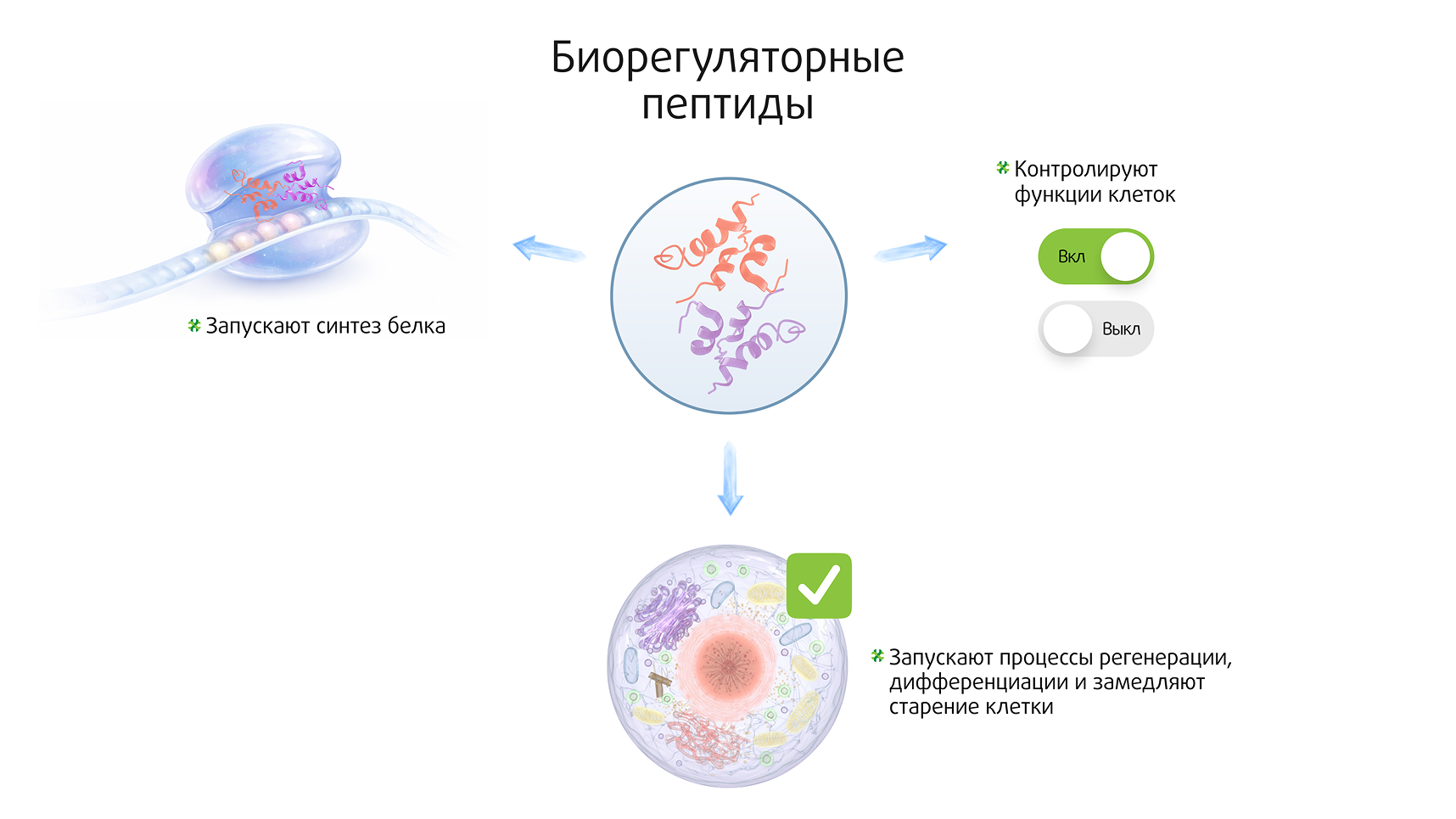 Фактически каждая клетка умеет чинить себя сама — в её ядре вырабатываются пептиды — соединения аминокислот, связанные белковыми связями, которые запускают синтез белка, процесс регенерации и восстанавливают функционал клетки, будь то синтез гормонов, утилизация токсинов, химические преобразования веществ.