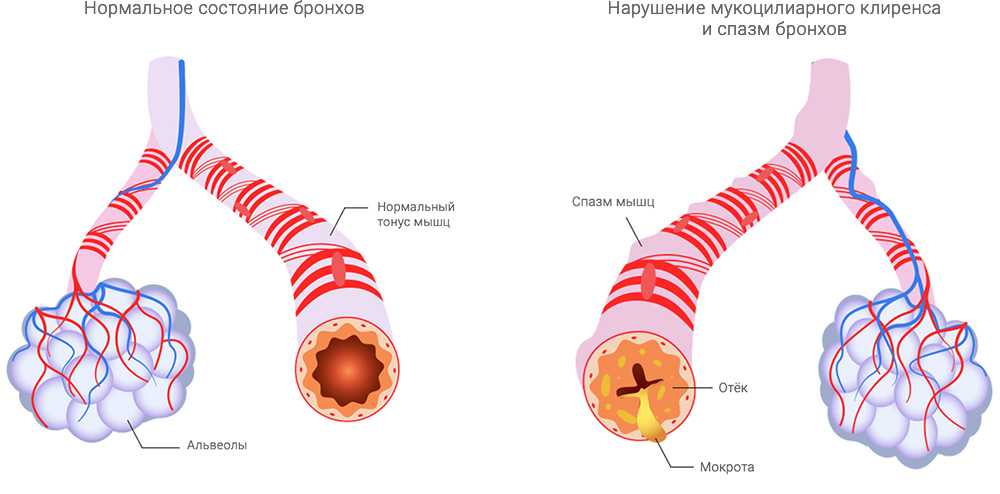 Наряду с этим бронхиальное дерево – это важная часть мукоцилиарного клиренса – системы защиты, которая очищает поступающий воздух от патогенов, пыли и других вредных частиц. Основной единицей мукоцилиарного клиренса являются клетки мерцательного (реснитчатого) эпителия. Они содержат реснички, которые как «сети», задерживают вредоносные компоненты воздуха. А слизь, покрывающая эти клетки сверху, в добавок еще богата секреторными иммуноглобулинами, которые помогают нейтрализовать застрявшие бактерии и вирусы. Однако так происходит только в норме.