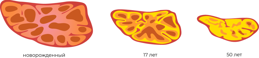 У тимуса есть еще одна важная характерная особенность — его активная работа в масштабе человеческой жизни длится достаточно недолго. Во взрослом возрасти тимус начинает постепенно атрофироваться, ткани постепенно замещаются жировыми, как следствие, затормаживается и выработка Т-лимфоцитов и гормонов тимуса. К 65 годам тимус человека становится полностью или практически полностью нефункциональным.
