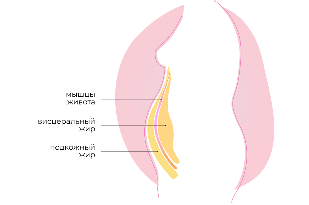 Отложение жира в области живота — проблема, которая носит не только эстетический характер. Висцеральный жир (который откладывается между внутренними органами), в отличие от подкожного, гораздо опаснее для здоровья. Именно он повышает риски сердечно-сосудистых и эндокринных заболеваний (в частности, сахарного диабета 2-го типа) и провоцирует воспалительные процессы.