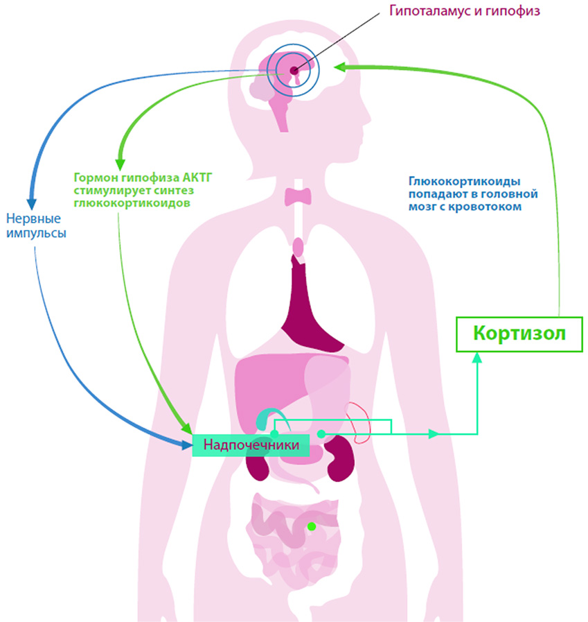 Гипоталамо-гипофизарная ось мозга дает сигнал коре надпочечников, которые отвечают выбросом другой группы гормонов стресса – глюкокортикоидов (кортизол), регулирующих дальнейшие изменения.