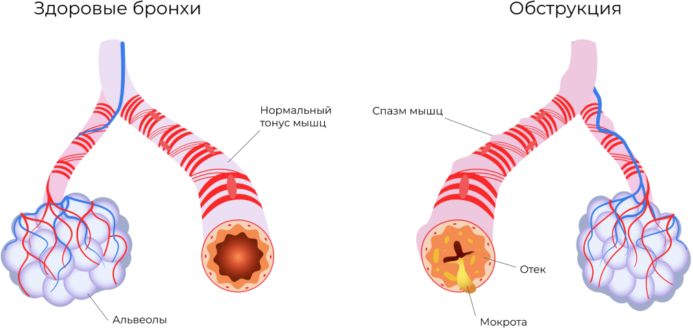 При пневмонии страдает все бронхиальное дерево. В норме бронхи и бронхиолы должны защищать альвеолы от патогенов и выводить их со слизью, поэтому развитие пневмонии может говорить о том, что они не справились со своей задачей. Это может произойти по причине острого воспаления в самих бронхах, или в силу того, что инфекции удалось спуститься по ним «незамеченной». Так или иначе при пневмонии — задача выводить мокроту приобретает особую сложность и может сопровождаться спазмом и отеком слизистой бронхов.
