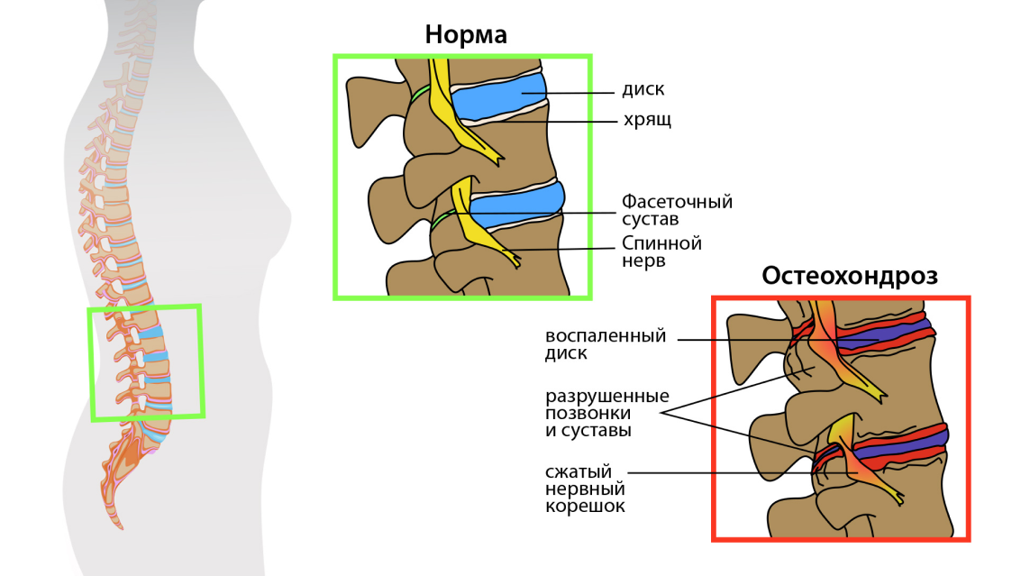 Постепенное изнашивание межпозвоночных дисков (дегенеративно-дистрофические изменения) приводит к остеохондрозу. Это состояние сопровождается болью, скованностью и ограничением подвижности.