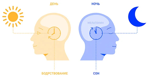 Но главный гормон эпифиза все же мелатонин, производимый из серотонина. Он регулирует циркадные ритмы организма – биологическую активность во время сна и бодрствования. Увеличение выработки мелатонина вызывает желание спать, а снижение его концентрации является стимулом к пробуждению. Во время сна мелатонин проникает практически во все клетки организма.
