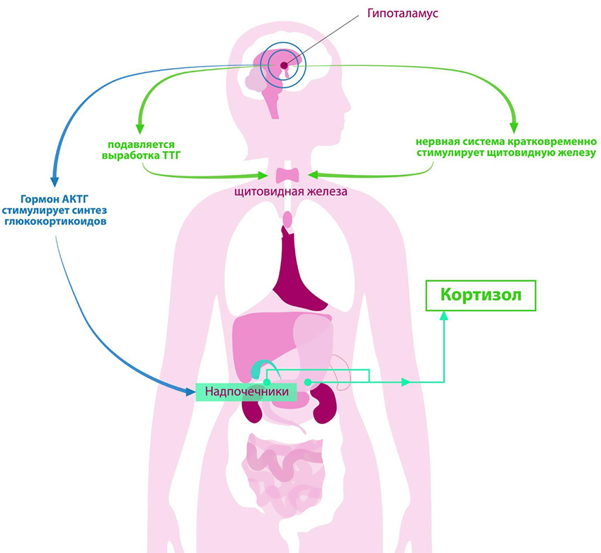 Также как и гормон АКТГ, стимулирующий синтез кортизола в надпочечниках, тиреотропный гормон (ТТГ), регулирующий работу щитовидной железы, вырабатывается гипофизом. При этом выработка АКТГ подавляет синтез ТТГ, но в нашем организме есть компенсаторный механизм – в момент стрессовой реакции работу щитовидной железы стимулируют непосредственно гормоны стресса адреналин и норадреналин через симпатическую нервную систему. Эта реакция довольно быстрая, при затяжном стрессе начинает превалировать выработка кортизола, и функция щитовидной железы подавляется.